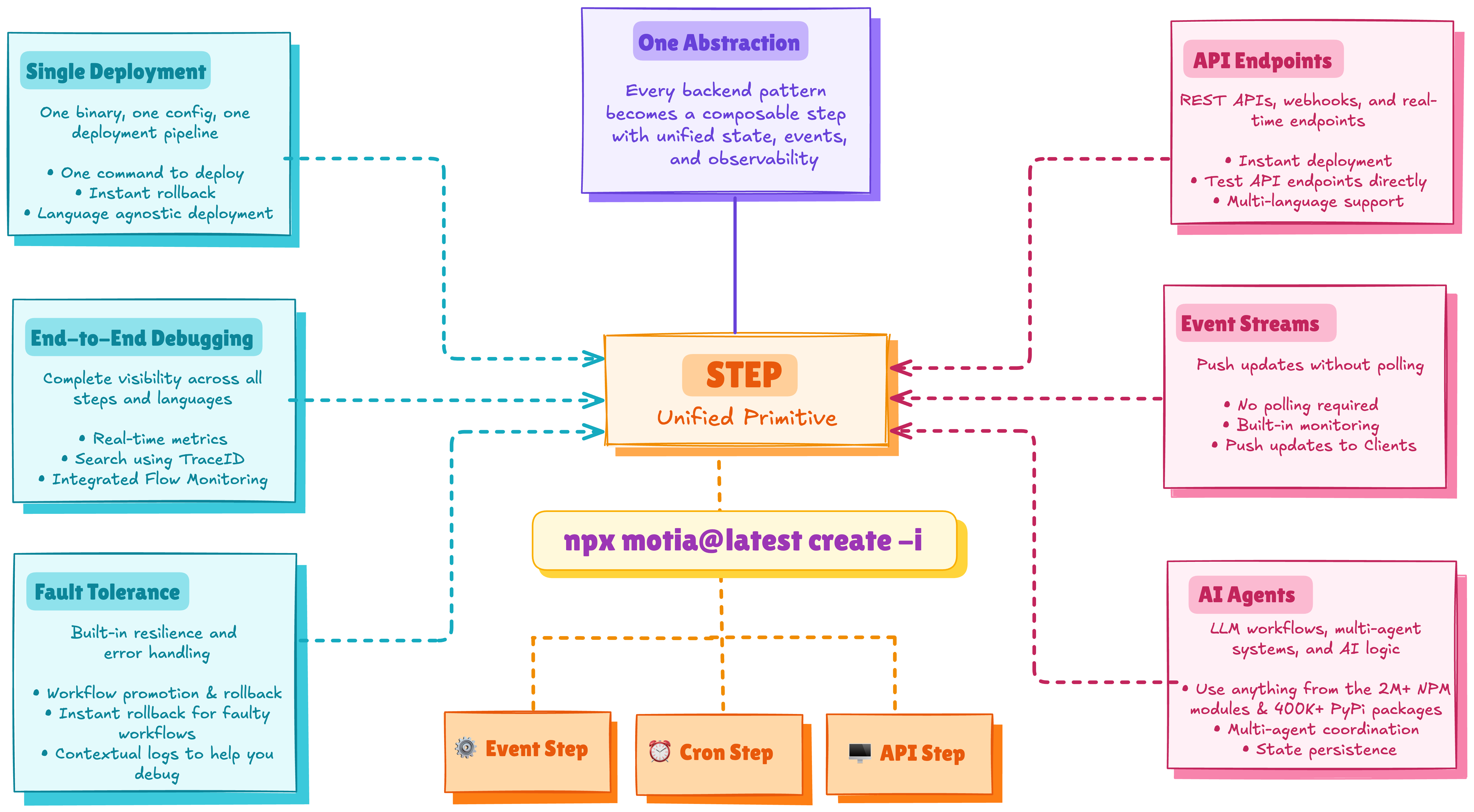 Just as React made frontend development simple by introducing components, Motia redefines backend development with Steps - a single primitive that handles everything.