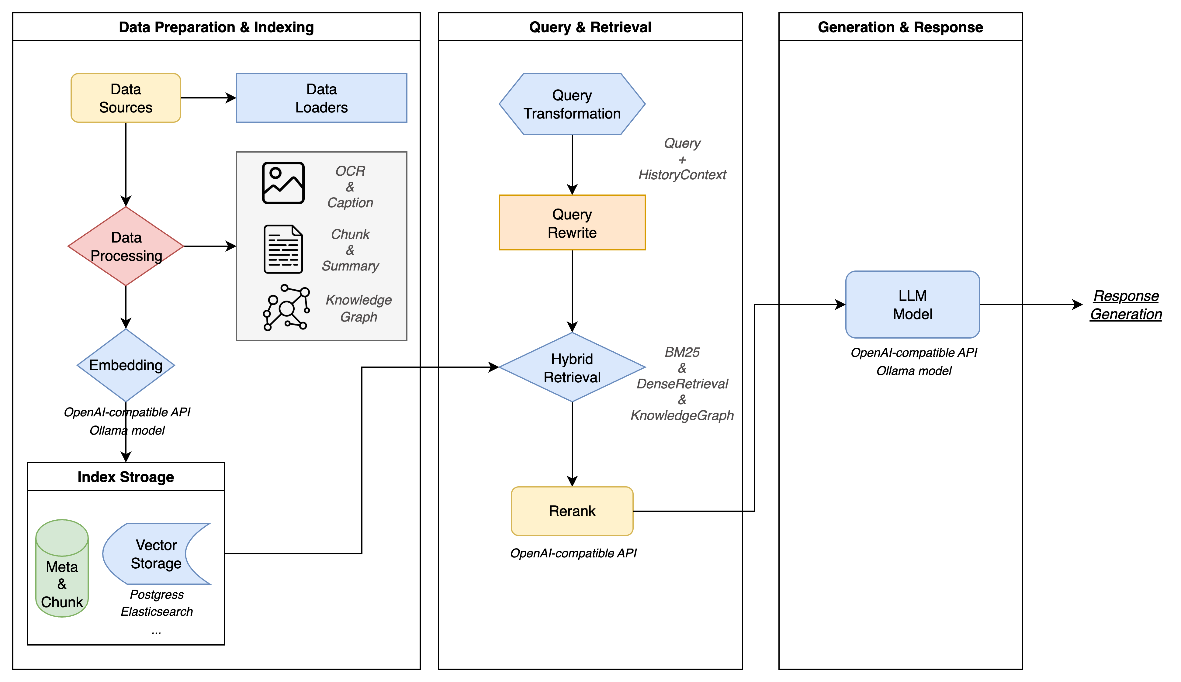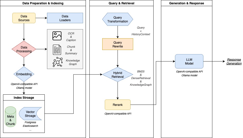 框架采用模块化架构,融合多模态预处理、语义向量索引、智能召回与大模型生成推理,构建起高效、可控的文档问答流程。核心检索流程基于 RAG(Retrieval-Augmented Generation) 机制,将上下文相关片段与语言模型结合,实现更高质量的语义回答。