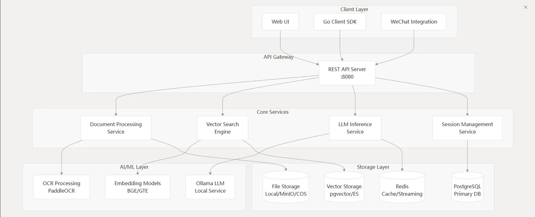 WeKnora 采用现代化模块化设计,构建了一条完整的文档理解与检索流水线。系统主要包括文档解析、向量化处理、检索引擎和大模型推理等核心模块,每个组件均可灵活配置与扩展。